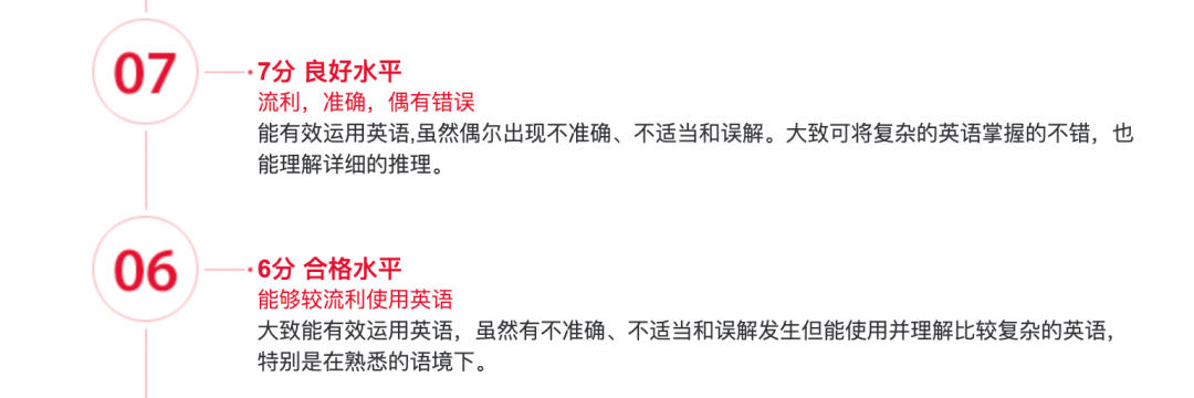 而雅思7分标准则如上图:流利,准确,偶有错误,意味着该分数的同学能够有效地运用英语,偶尔出现不准确,对复杂的英语掌握的较好。