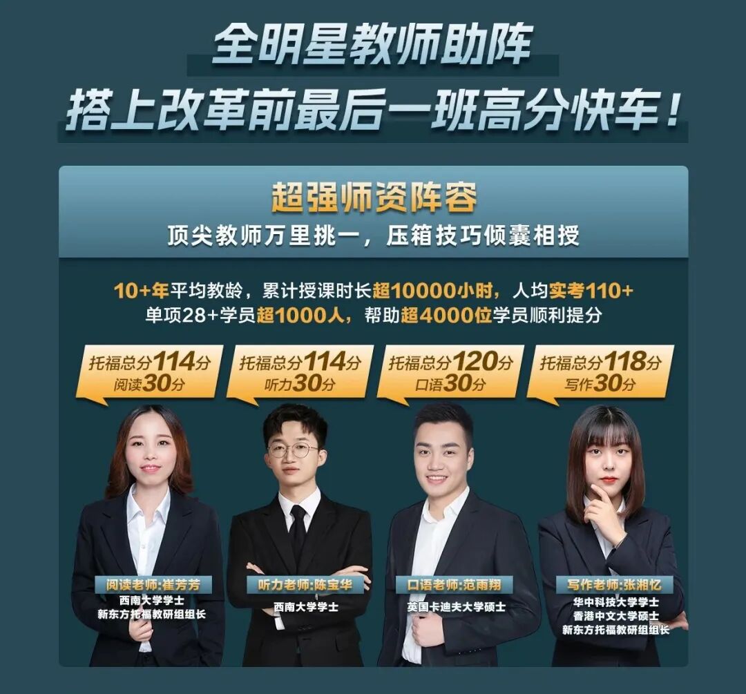 那么建议你抓住改革前的冲刺机会,在接下来的时间里集中学习并尽力考试改革前取得理想成绩,避免熟悉新题型的额外负担。为此,重庆新东方集结对托福考试深入研究的顶尖师资团队,重磅发布【托福封箱大师班】,名额有限,扫描文末二维码完成学情检测,即可了解详情!