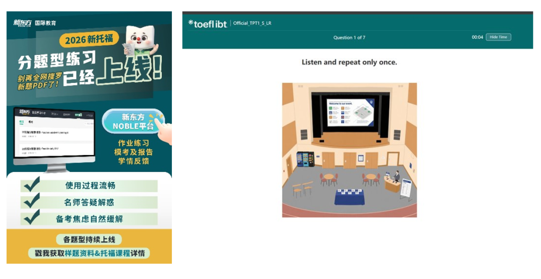 为了让同学们第一时间体验并尽快适应新托福考试,新东方NOBLE学习平台已全面上线新托福模考系统,高度还原真实考试界面与题型。在这里,你不仅能反复练习、熟悉操作,更可以提前感知考试节奏,积累实战经验。这意味着当别人还在考场上紧张地熟悉流程和试错时,你已经可以从容、高效地专注答题,稳稳赢在起点。