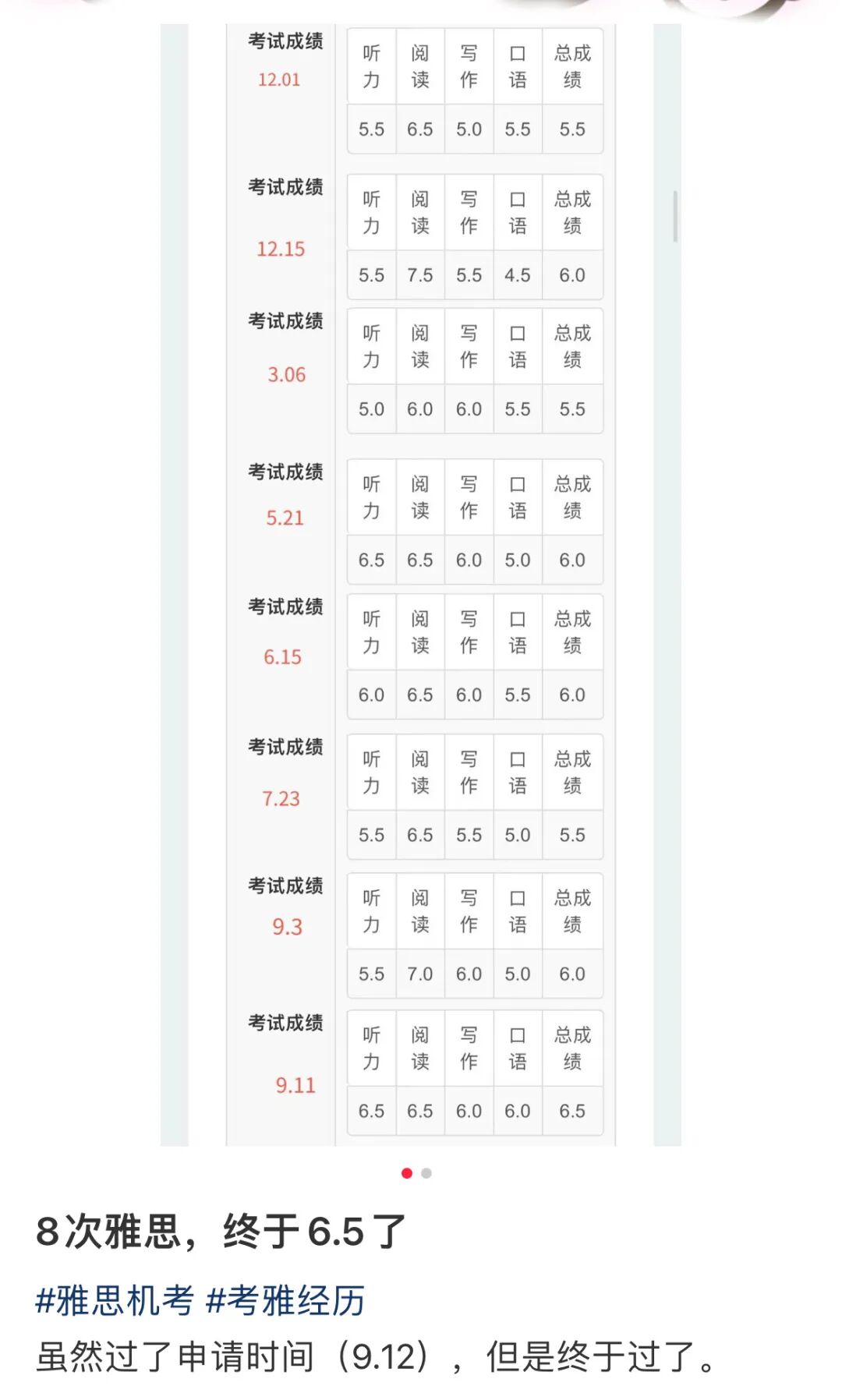 @Luyn:看xhs上人均9分,真的考了才知道雅思有多难!我考了5次才拿到6.5。个人感觉英语还是要靠日积月累,写作我后来找了专业的老师辅导,提升比较快,口语和听力就不厌其烦地练习,慢慢分数就上去了。