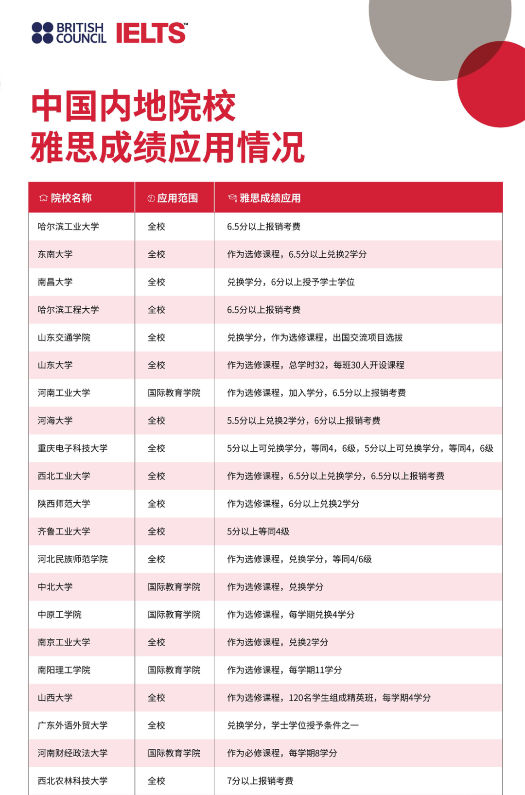 根据《中国内地院校雅思成绩应用情况》以及雅思官网的最新盘点,雅思成绩除了可以用作留学申请外,已有近300所国内高校将雅思作为权威英语能力评定标准!比如,雅思可以作为选校课程兑换学分,免修大学英语。