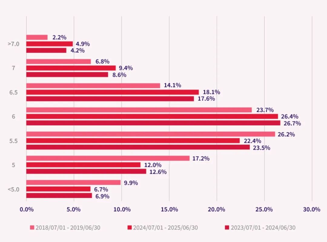 6分以上考生近六成,成绩梯队稳定;6.5分以上占30.4%,7分高分段占比略降,5.5分以下低分段占比上升。