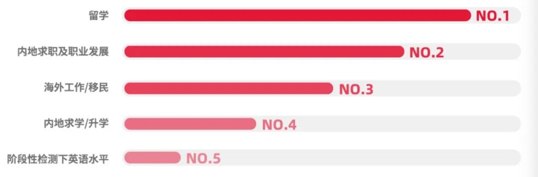 “海外留学”仍是中国大陆地区考生报考雅思的核心动因,在“多国联申”的主流申请趋势下,覆盖140多个国家和地区、获得超过12,500家院校、机构认可的雅思考试成为考生首选的语言能力考试之一。