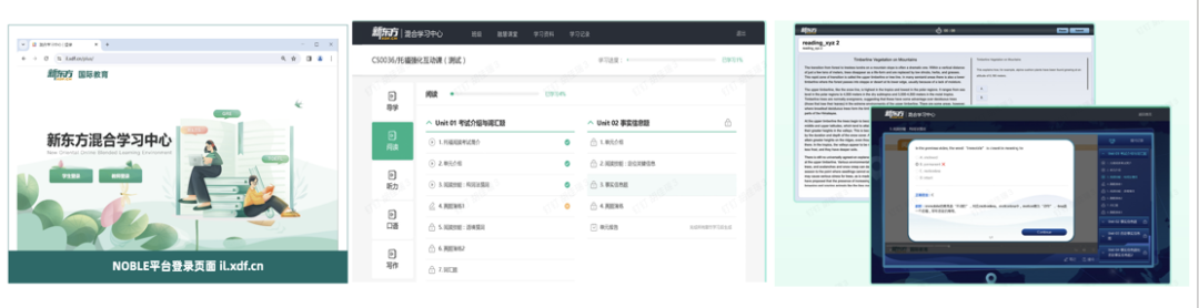 NOBLE平台内嵌雅思口语、写作练习和模拟考试的AI工具,以雅思官方评分维度为AI语言模型学习的评判基准,科学高效地给出成绩综合建议。使做题流程线上化、测评批改功能智能化、反馈内容精细化、服务个性化,让学习中的每个细节体验都被温柔以待。