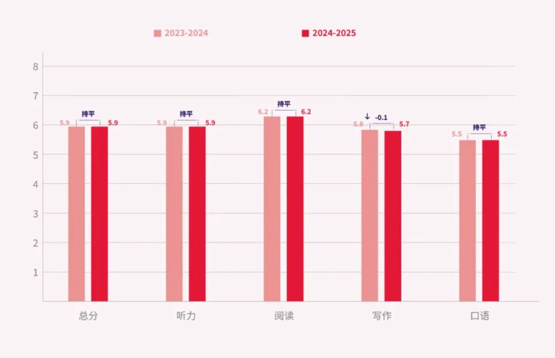 2024–2025中国内地学术类雅思均分5.9,与上一年度基本持平。阅读依旧是优势单项,而口语仍是多数考生的短板与突破关键。