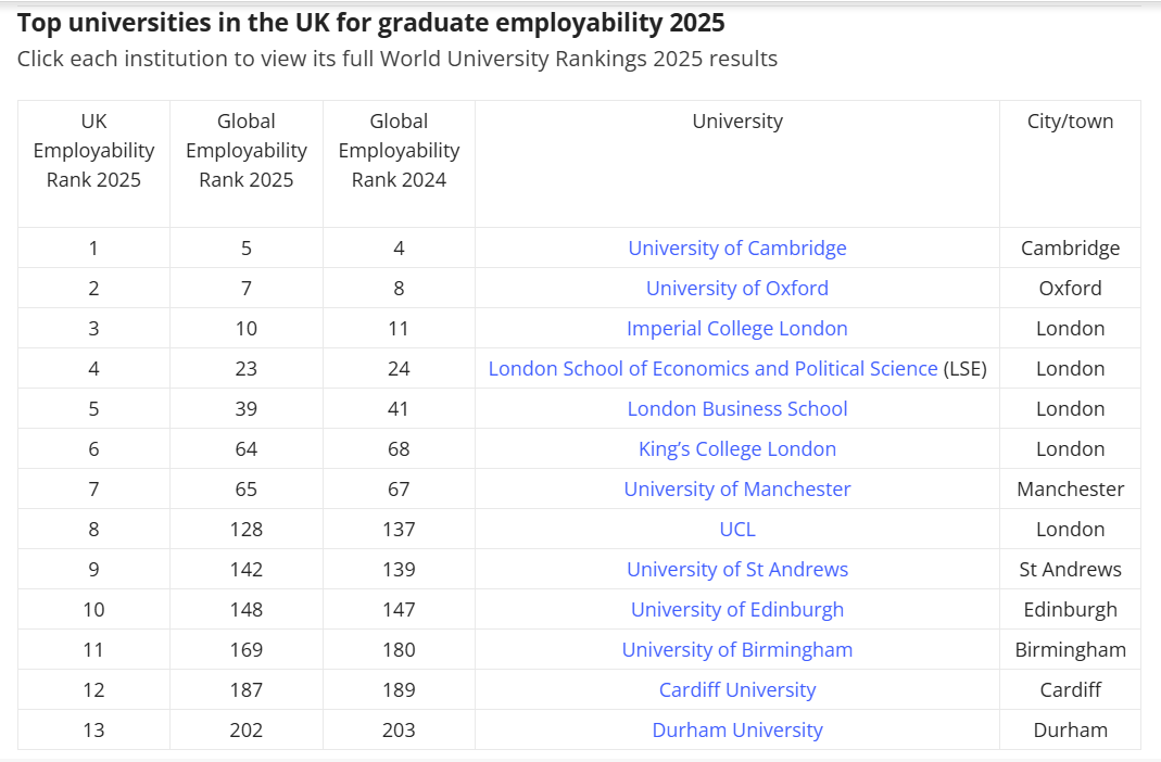 根据2025泰晤士英国大学毕业生就业力排名,我们能直观地看到,以下13所英国高校培养出了最具就业能力的毕业生~
