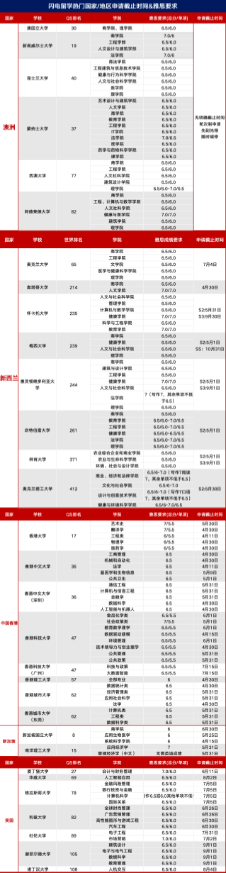 海外院校申请大多数为轮次制,奉行先到先得原则,现在仅处于第一第二轮的状态。从历年闪电留学同学们的选择来看,热门目的地国家和地区多为英国、澳新、中国港澳地区和广泛的欧亚地区,加拿大地区也是很多同学求学的目的地。以下为部分热门院校申请的截止时间