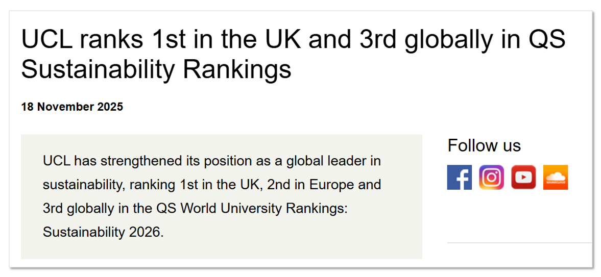 UCL在2026年的QS可持续发展大学排名(QS World University Rankings: Sustainability 2026)中蝉联全英第一名,跃升为世界第三名!