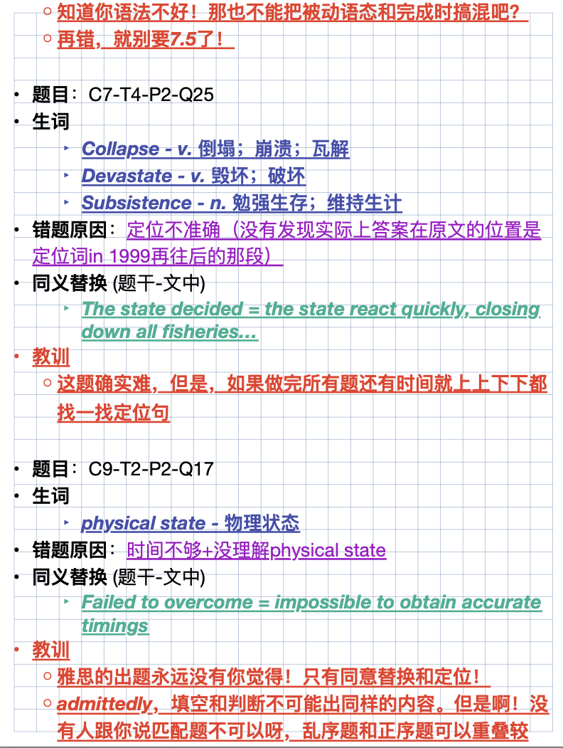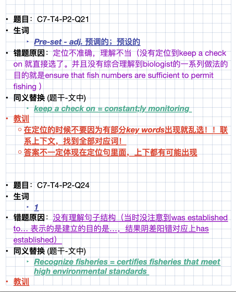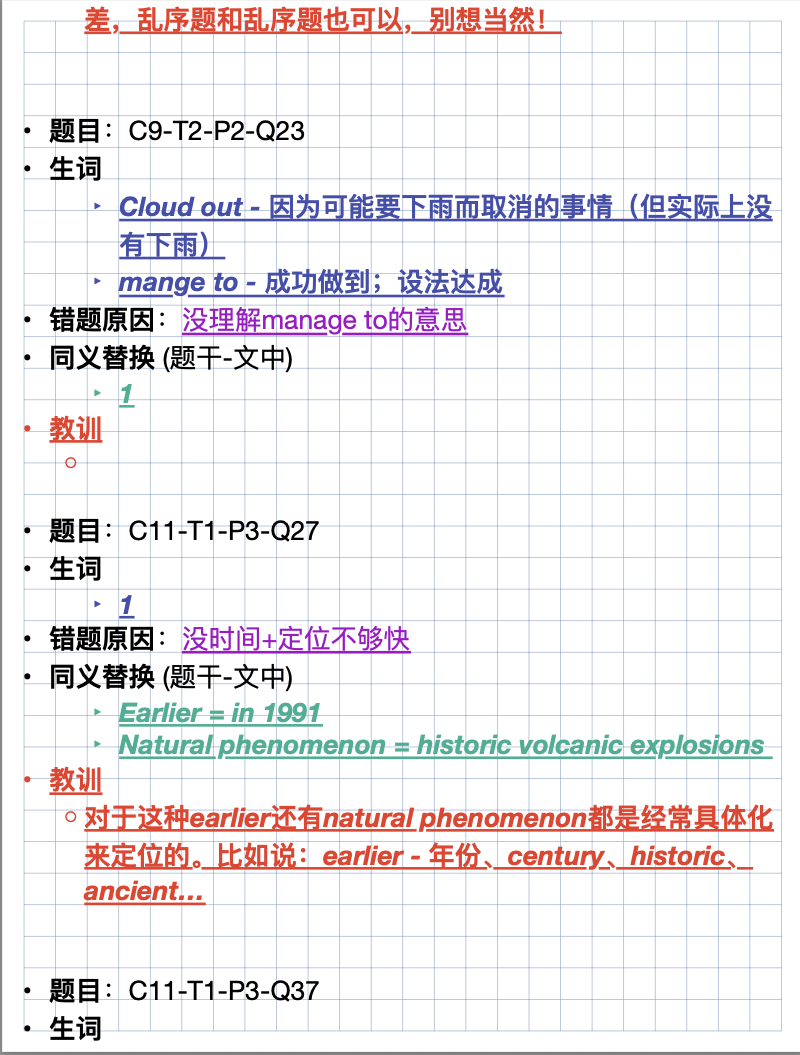 ⭐️刷题反思:每天1篇真题阅读,严格控制在20分钟内,每道错题都要找到“题干关键词-文章同义替换词”的对应关系,整理成专属“替换词手册”。比如题干“important”对应文章“vital”“crucial”,避免下次再因替换未识别丢分。同时标注错题类型(定位错误、理解偏差、细节遗漏),针对性强化薄弱环节。