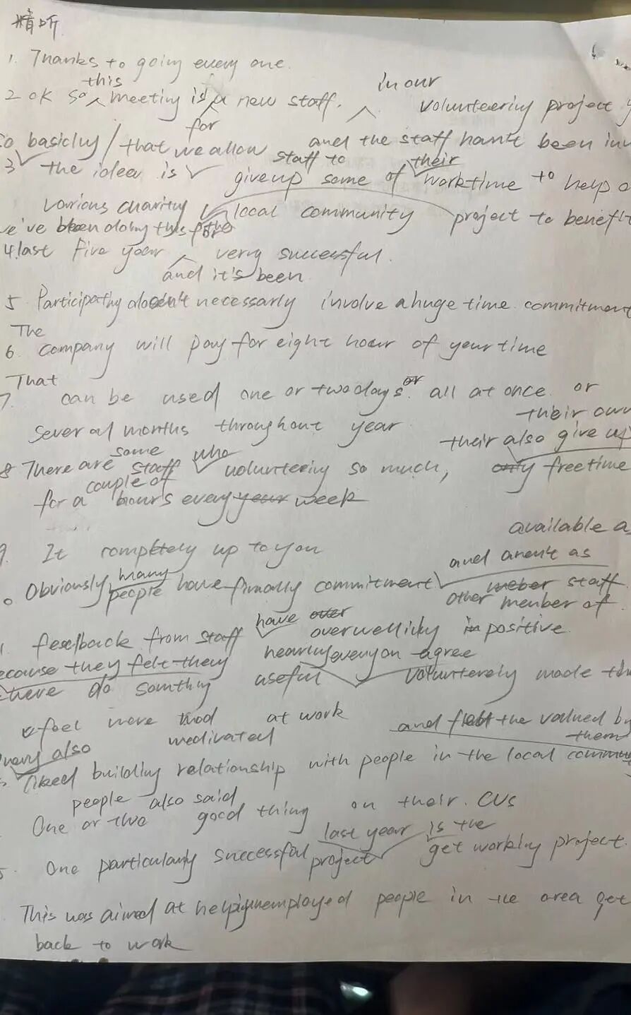 ⭐️提能练习:每天1小时精听part 2-part 3原文,尝试在听句的过程中识别主谓宾等核心主干信息,并且进行记录,然后再逐步补充句中其余信息。遇到生词或者比较地道的口语表达可以积累下来,接着再进行跟读,模仿连读弱读,强化口语发音和听力的联动。