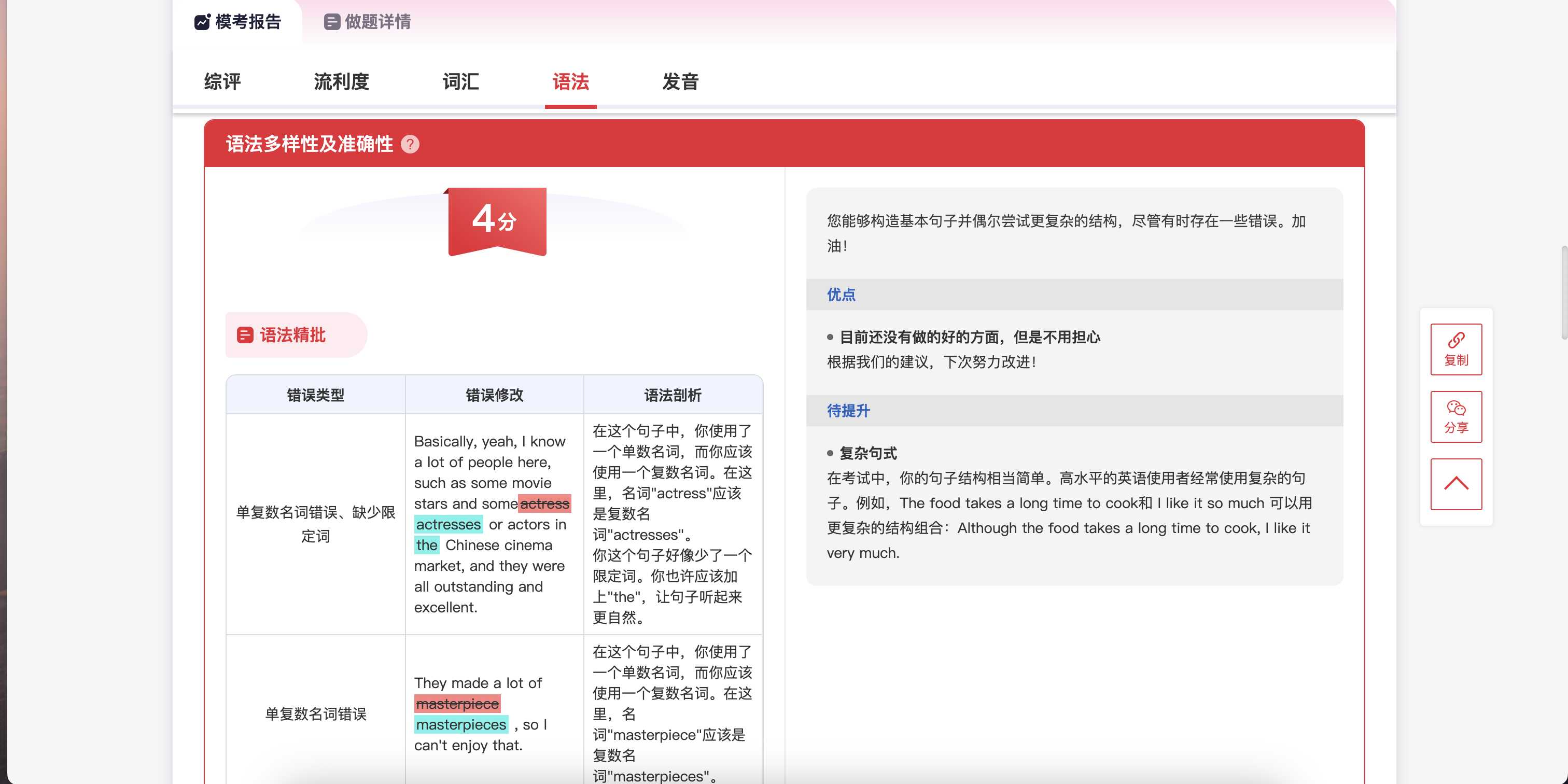 ⭐️刷题反思:练习后录音,复盘时关注“卡顿点”“语法小错”“话题拓展不足”等问题。比如有没有频繁出现时态错误或冠词遗漏,把问题整理出来针对性纠正。也可以使用新东方口语AI批改工具来进行诊断。