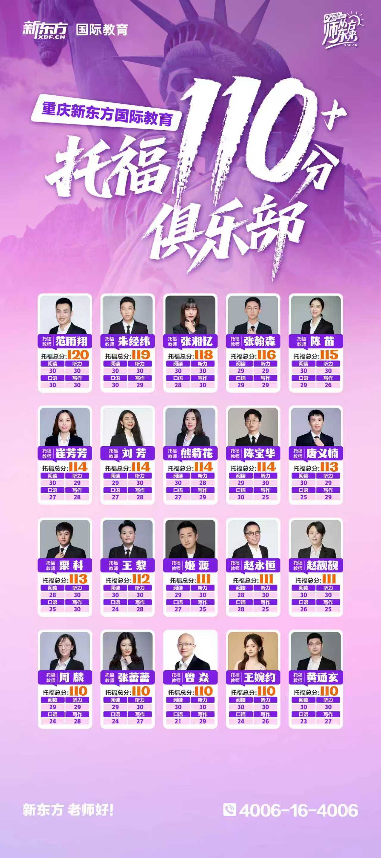 重庆新东方国际教育「托福 110 + 俱乐部」20 位总分 110 + 的明星教师坐镇,其中更有总分 120 分的满分大神,用实打实的成绩单告诉你:跟着他们学,托福高分就是水到渠成的事。