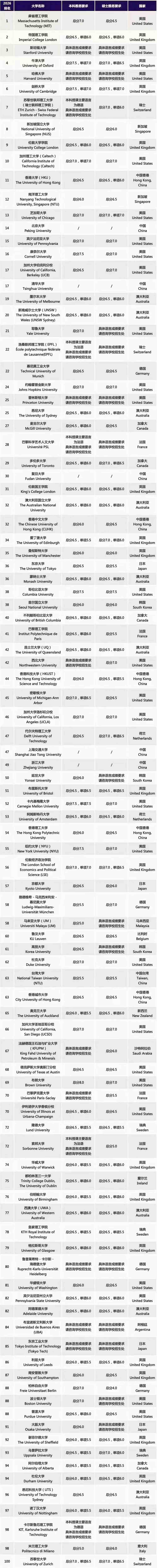 针对QS排名前100的17所大学来说,做出最新调整的就是以上者三所大学了,其他院校的雅思成绩要求维持之前的不变。