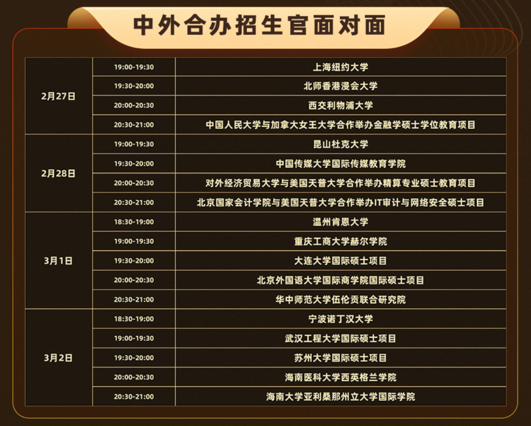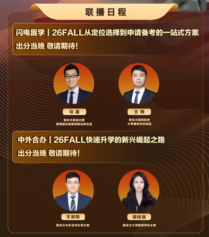 想快速筛选靠谱项目、了解申请条件与流程,也请务必关注新东方国际教育公众号/视频号!自出分当晚,新东方资深老师联合各大项目/院校招生官与你面对面,将连续多天详细解读中外合办硕士升学路径。
