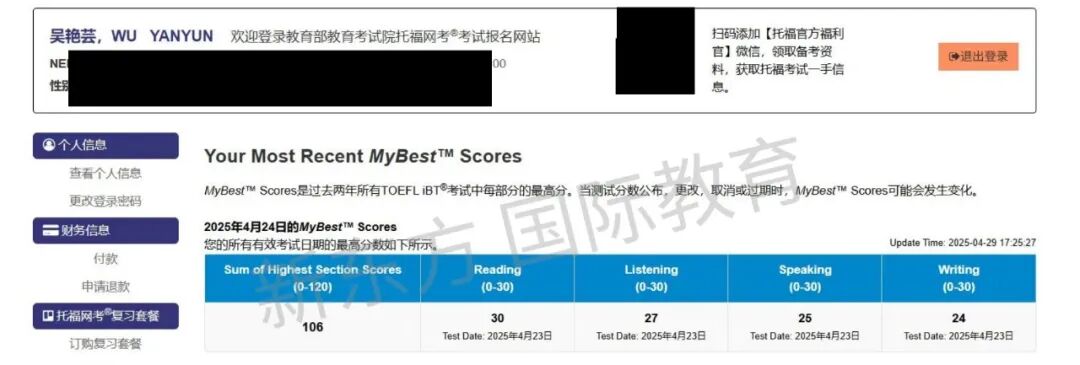 托福成绩是106分,其中阅读科目成绩是30分,听力科目成绩是27分。