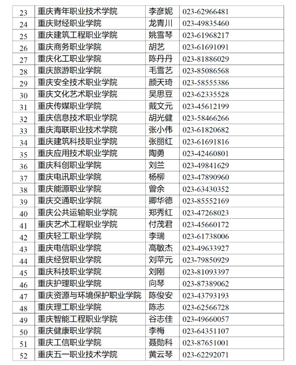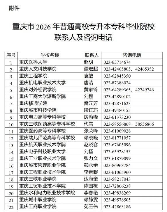 2026年重庆市普通高校专升本招生工作已全面启动,为确保考生及家长及时获取报考信息,官方公布了全市52所专科院校的专升本联系人与咨询电话。列表涵盖重庆医科大学、重庆人文科技学院、重庆电力高等专科学校、重庆工业职业技术学院、重庆城市管理职业学院等院校,每所院校均指定专人负责政策咨询。其中,重庆医科大学联系人赵明(023-65714674)、重庆人文科技学院联系人谭宏超(023-42465805)等均可在工作时间提供报考指导。考生需注意,报考资格审核由专科毕业院校负责,报名时需根据自身情况选择“普通毕业年级考生”“基层就业毕业生”“退役大学生士兵”或“技能竞赛免试生”其中一类,且报名后不得更改类别。建议考生提前联系所在院校,核实专业类别、考试科目(文科考语文、理科考数学)及材料提交要求,以便顺利完成网上报名(报名网址:https://www.cqksy.cn)