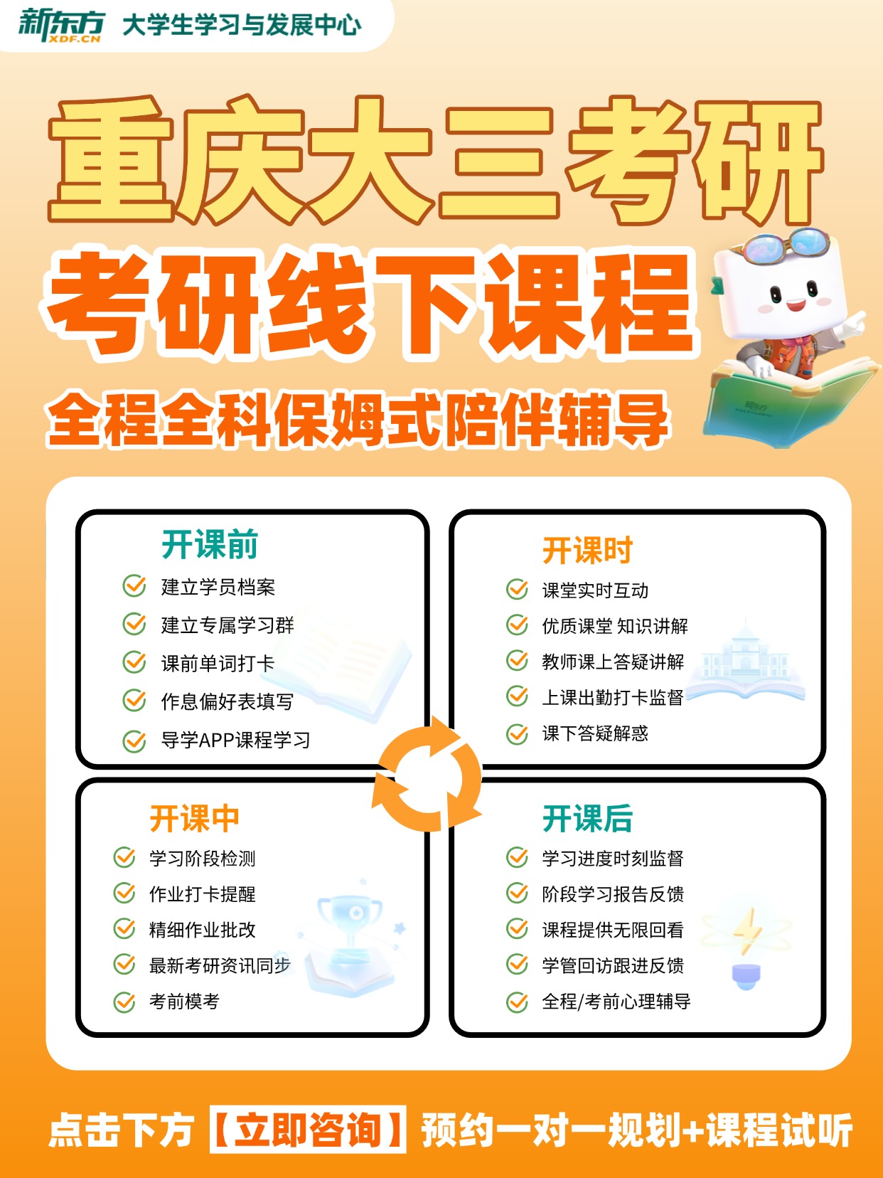 对于每一位在职考研人而言,最大的挑战莫过于如何在繁忙工作的夹缝中,构建一套系统、高效且可持续的备考体系。时间碎片化、精力疲惫、信息孤立是横亘在前的普遍困境。重庆新东方考研针对在职考生的独特节奏,设计了高度适配的周末走读面授班与线上课程融合方案,其核心价值在于将不可控的业余时间,转化为稳定、可见的复习进度。