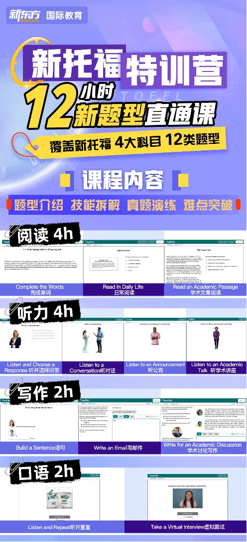 这次改革绝不是简单调题型、改题数那么简单。如果只做表面功夫,很容易陷入“练得辛苦,收效甚微”的困境。新东方投入顶级资源,依托30余年教学沉淀与超1亿条学习数据,将新托福置于全球语言测评体系中进行深度研发。不仅紧盯新题型,更深入理解改革背后的能力新要求。全新课程将帮助你在巩固核心英语能力的基础上,精准掌握解题技巧,实现“考得好”和“用得好”的双重目标。