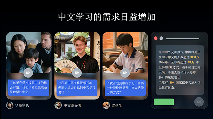 但是,很多海外中文学习者仍面临高成本、低效率、缺语境等痛点,集中体现在三个方面:首先,学习缺乏系统性。面对大量零散资料,学习者往往陷入“无从下手”的迷茫。其次,语言环境缺失。即便掌握一定的词汇与语法,也难以在真实场景中灵活运用,最终导致“学用脱节”。第三,科学指导不足。中文与英文在语言逻辑、表达习惯上存在显著差异,许多学习者沿用英文学习思维,却得不到针对性的方法指引。