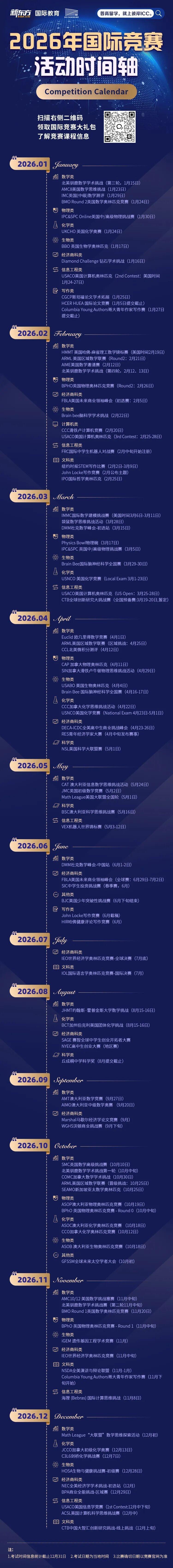 国际竞赛种类众多,新东方已将2026全年高含金量的国际竞赛时间汇总好,无论你已经报名还是备考,都值得一键收藏。大部分竞赛报名截止时间为考试时间前半个月左右,具体可以扫码咨询小助手~