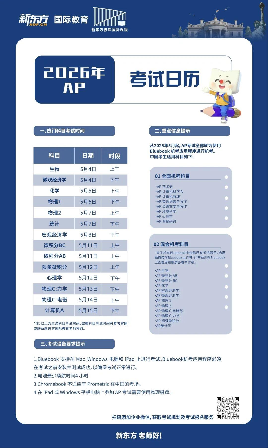 从2025年5月起,AP考试全部转为使用Bluebook机考应用程序进行机考,同学们需注意设备要求以及考试形式适应。为了能够帮助考生们应对这一最新变动,经过平均教龄超10年的教学研发团队不懈努力,新东方AP机考模拟平台已经于全国上线,提供以下7门中国学生主流选择科目的模考服务: