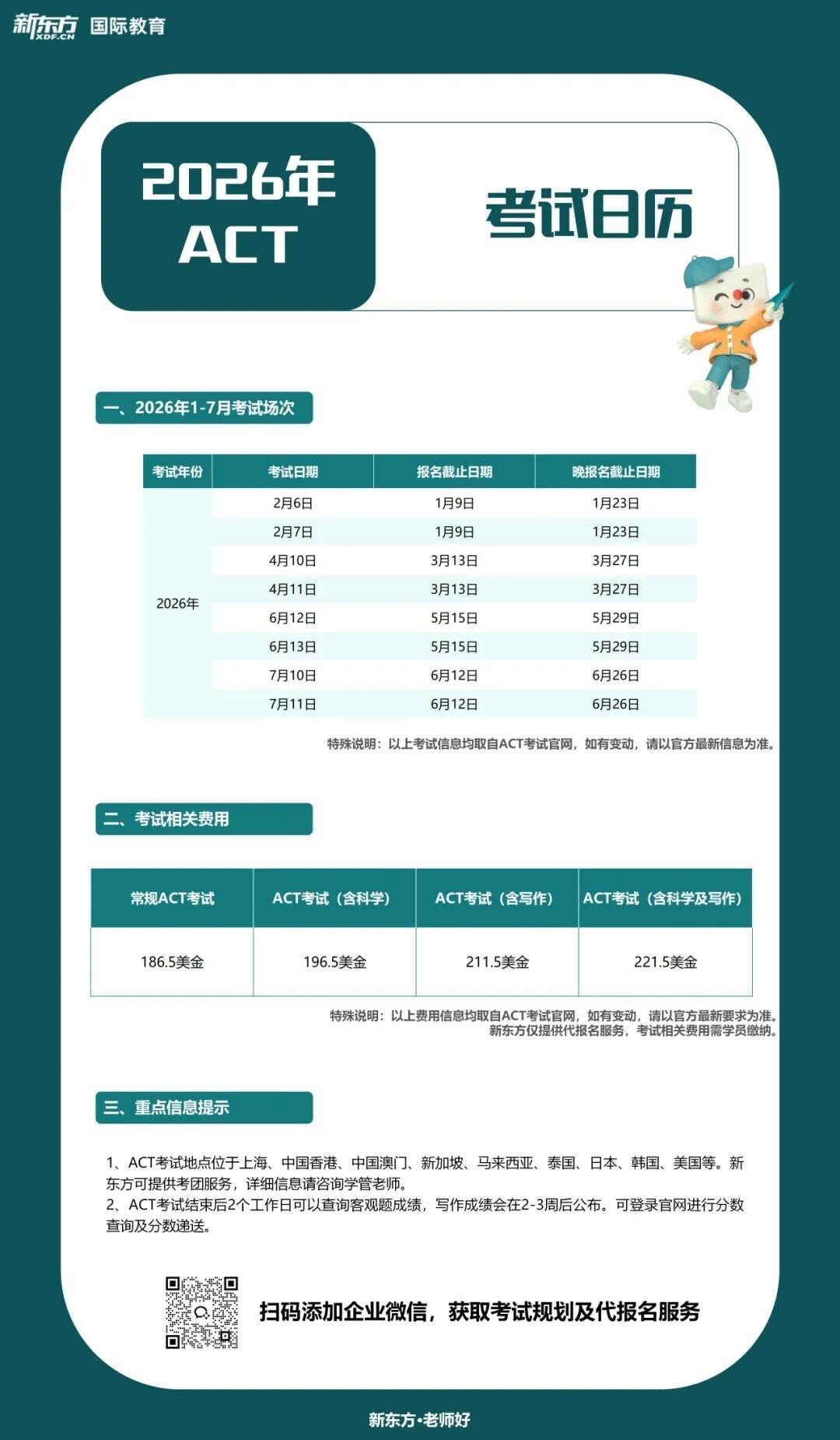 2026年ACT考试日历如下: