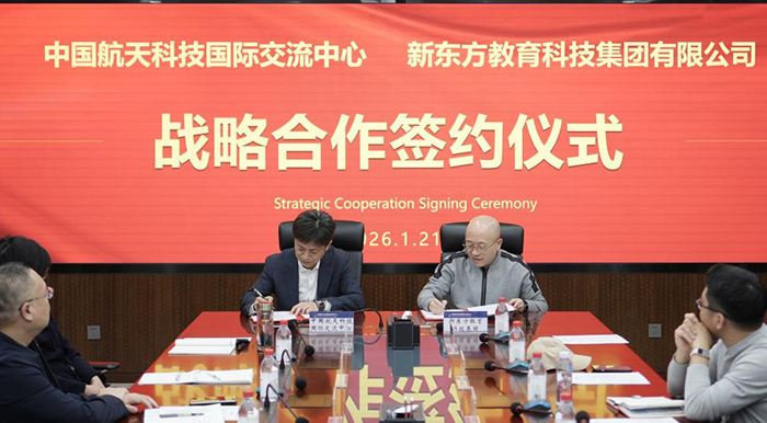 1月21日,中国航天科技国际交流中心与新东方教育科技集团有限公司签署战略合作协议。国际交流中心主任于淼与新东方教育科技集团副总裁柴明一,就推进落实双方战略合作进行了深入交流。