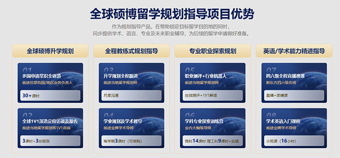 新东方前途出国的优势在于择校灵活,提供定制化“主申+联申”院校组合,助学生手握多份offer,掌握择校主动权;全程服务覆盖规划期、申请准备期、学业精进期,包含1V1定位访谈、语言备考课程、职业测评、申请材料指导、海外学术督导等;背景提升方面,针对提升语言、科研与实习等软实力,弥补背景短板,适配多国院校录取标准;同时提供资源加持,享受总部专业课程、当地规划师月度跟进、金牌导师学术指导的全程资源支持。