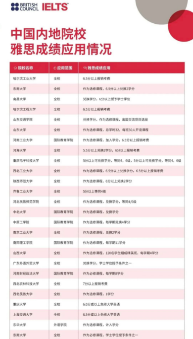 目前已有近300所国内大学的认可雅思成绩。许多国内高校都出台了本科和硕博士的“外语免修政策”:只要雅思成绩达到相应标准,你就可以免修大学英语课程,还能用雅思成绩兑换相应课程学分。